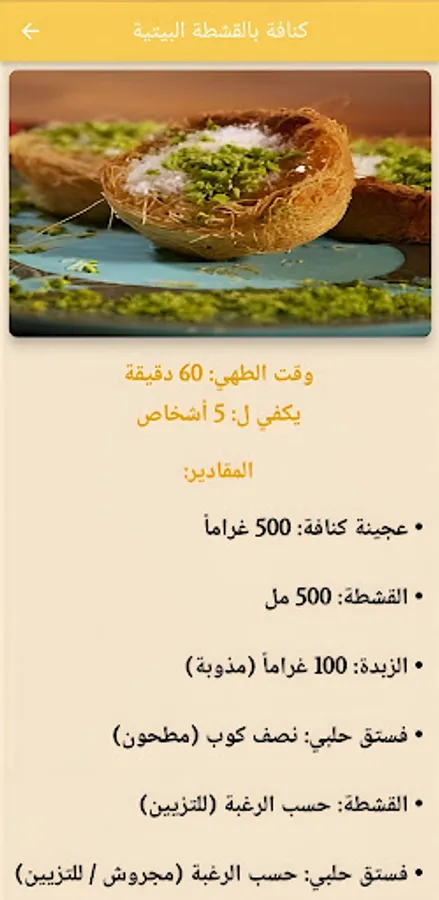 The Delicious Kunafa application includes clear details of each step in the Kunafa preparation process, from choosing the right ingredients to the final steps to serving the Kunafa in a delicious and impressive way. The app also allows for customizing recipes according to user preferences, such as adjusting ingredient amounts or adding additional ingredients.