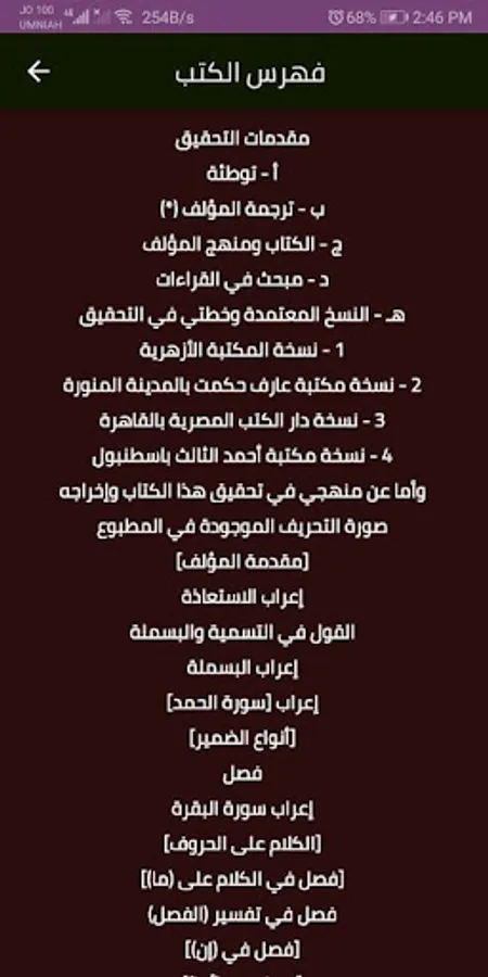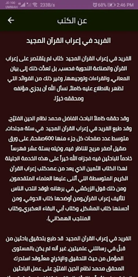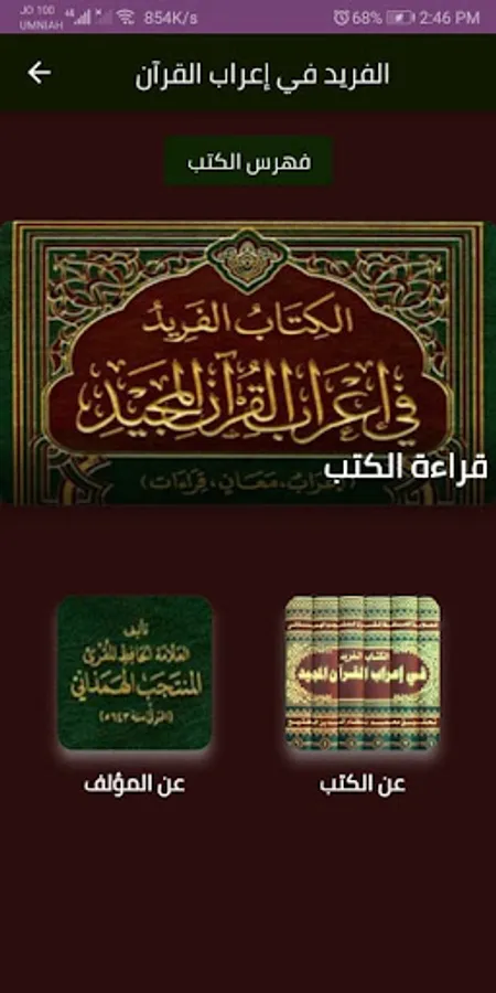 The application of Kitab Al-Farid in the syntax of the Glorious Qur’an is an application that displays the entire book of the application of Kitab Al-Farid in the syntax of the Glorious Qur’an by its author Al-Munjab Al-Hamadhani in all its parts. Index section that displays all the topics that the application talks about