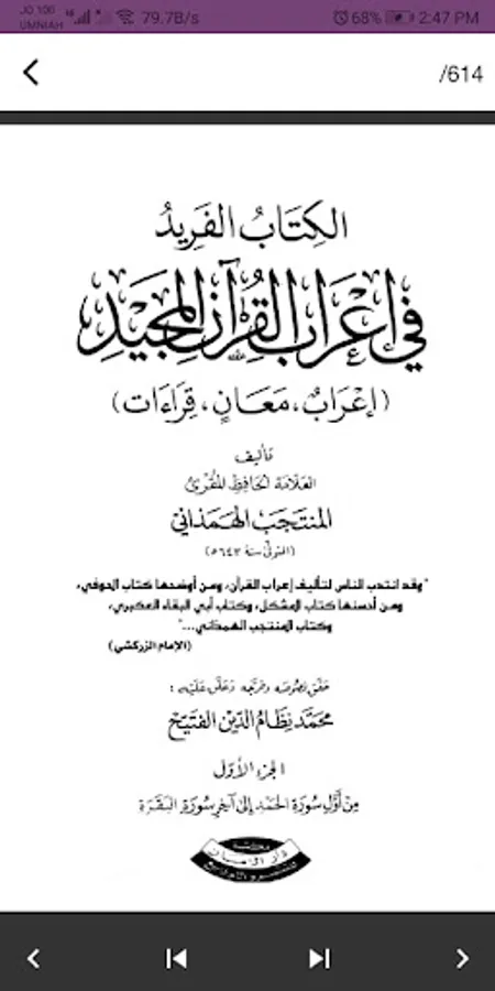 It was fully achieved by the virtuous researcher Muhammad Nizam Al-Din Al-Fateh. The unique parsing of the Glorious Qur’an was printed in six volumes. The average number of pages for each part is 600 pages, which you can read in full through the application. The venerable book of this precious book, which is considered one of the intermediate books of the parsing of the Noble Qur’an that the advanced scholars praised