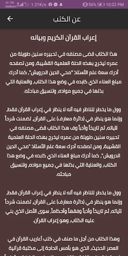 The application of the book of the parsing of the Noble Qur’an and its statement is an application that displays the entire book of the parsing of the Noble Qur’an and its statement by its author, Mohi Al-Din Darwish, which talks about the entire parsing of the book of the Noble Qur’an. In its entirety and its entire surah