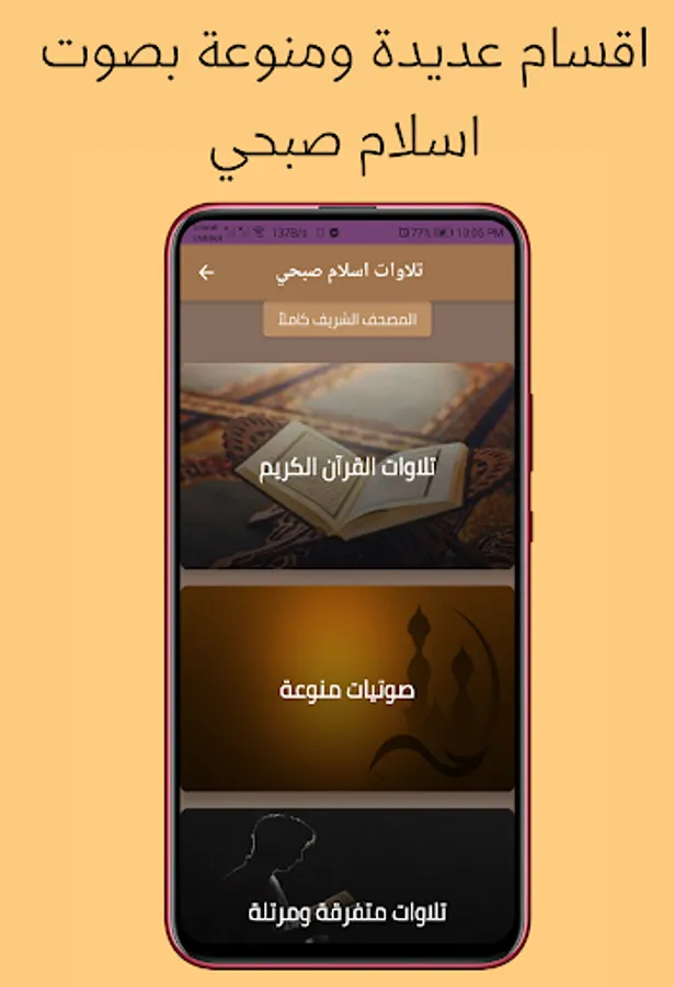 And in the application of Islam Sobhi Quran complete, you will find three different sections for the reciter and vocalist Islam Sobhi, and these sections are divided as follows: