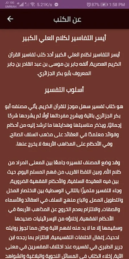It is a book of easy and concise interpretation of the Holy Qur’an, compiled by Abu Bakr Al-Jazaery with the verse and explains its vocabulary first and then explains it in a general way, and mentions its appropriateness and guidance, as it guides to the rulings and benefits based on the beliefs on the doctrine of the righteous predecessors, and in the rulings on the four schools of thought does not depart from it.