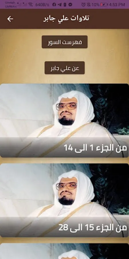 This section contains the recitations of the Qur’an from Part 1 to Part 14, with the voice of Sheikh Ali Jaber, and from the surahs available in this part