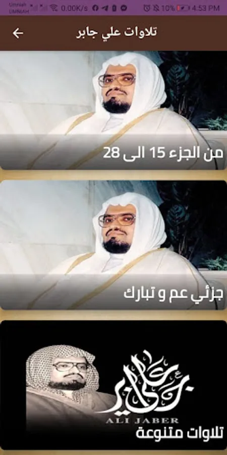 Download now the Ali Jaber recitations application for free and exclusively via the Google Play app store and enjoy listening to Ali Jaber's recitations of the Holy Quran in full through this application.