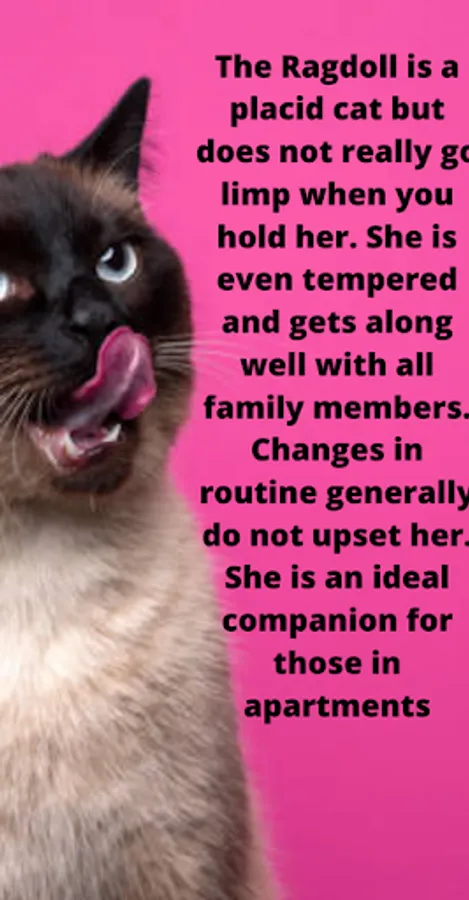 The Ragdoll is a placid cat but does not really go limp when you hold her. She is even tempered and gets along well with all family members. Changes in routine generally do not upset her. She is an ideal companion for those in apartments