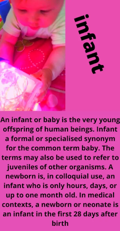 An infant or baby is the very young offspring of human beings. Infant a formal or specialised synonym for the common term baby. The terms may also be used to refer to juveniles of other organisms. A newborn is, in colloquial use, an infant who is only hours, days, or up to one month old. In medical contexts, a newborn or neonate is an infant in the first 28 days after birth