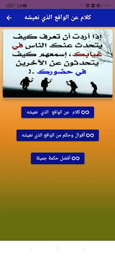 Words from the depth of reality and life, words and sayings of wisdom, as well as expressive and poignant thoughts that shake hearts and move feelings. We have collected them for you in beautiful pictures with wonderful designs to suit your tastes. They are diverse pictures to suit all age groups. They carry within them the most beautiful and realistic phrases and wisdom that the Arab peoples before us have experienced. A summary for you in written words. There are images collected in one application that is small in size and has a large content so that you do not get bored of it. We challenge it and add images of wisdom and thoughts, words from the depth of reality and life, words of wisdom, and sayings. It also provides you with the ability to share your favorite backgrounds on all social networking sites; There are other features that I will let you discover for yourself.