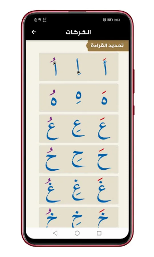 Each letter has a picture with the pronunciation according to the type of diacritics, including the damma, the fatha, the kasra, the tanween, the intensity and the duration
