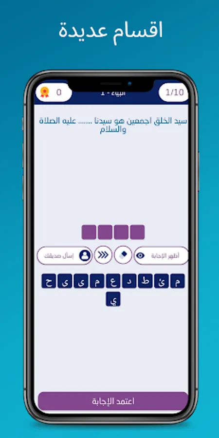 From the main interface of the application of religious questions: Test your religious knowledge. You can choose the section in which you want to do the test, and it will show you the page of the level that starts from 1 to several levels according to the number of levels in each section, and from it you choose the first level at the beginning, then the test begins with a screen on which the question appears and below it are boxes Empty boxes below that contain letters You fill in these spaces according to the answer to the question and the answer is approved after that and then you move on to the next question until all the questions are completed in this level and you move to the next level