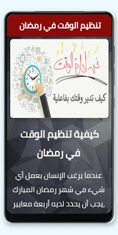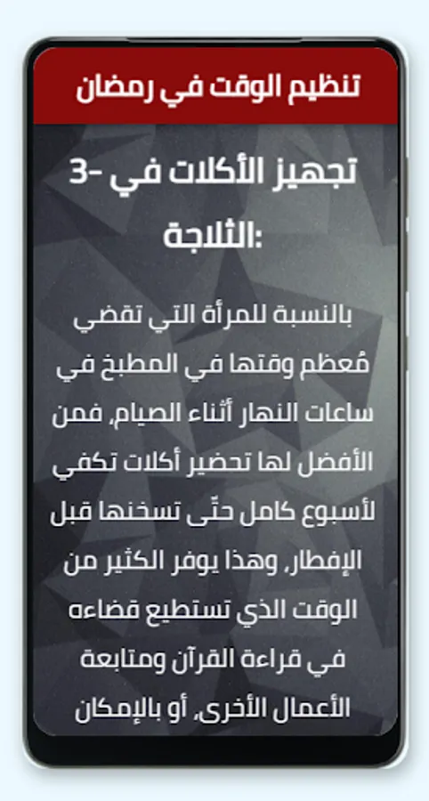 The application shows how to organize and use time in Ramadan to suit fasting and fatigue of fasting, and for women who are responsible for preparing and preparing the Iftar meal