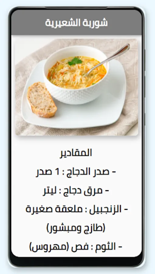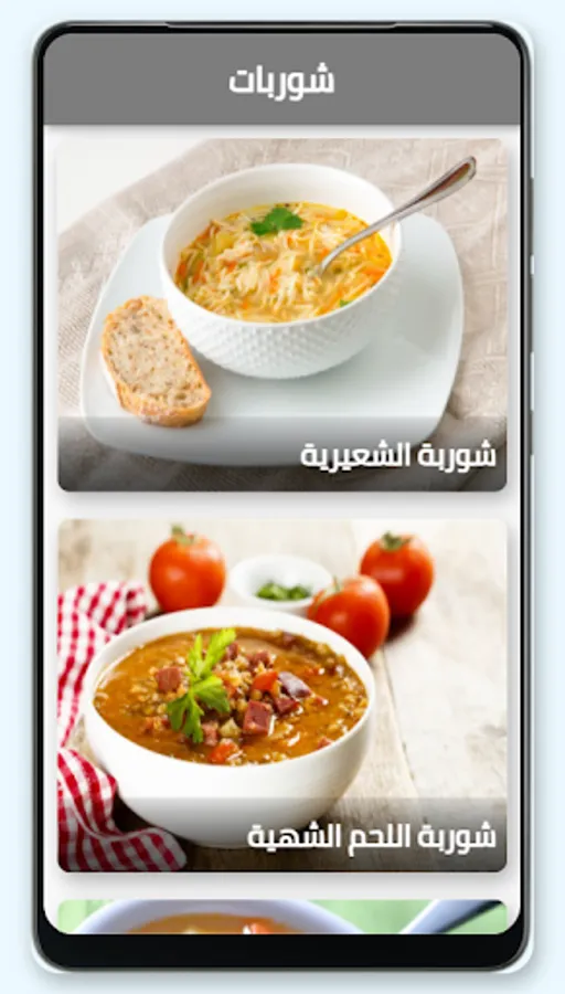 Soups app contains multiple types of soups, their ingredients, the way to prepare them, and a picture of each type of soup, such as ground meat soup and many other types