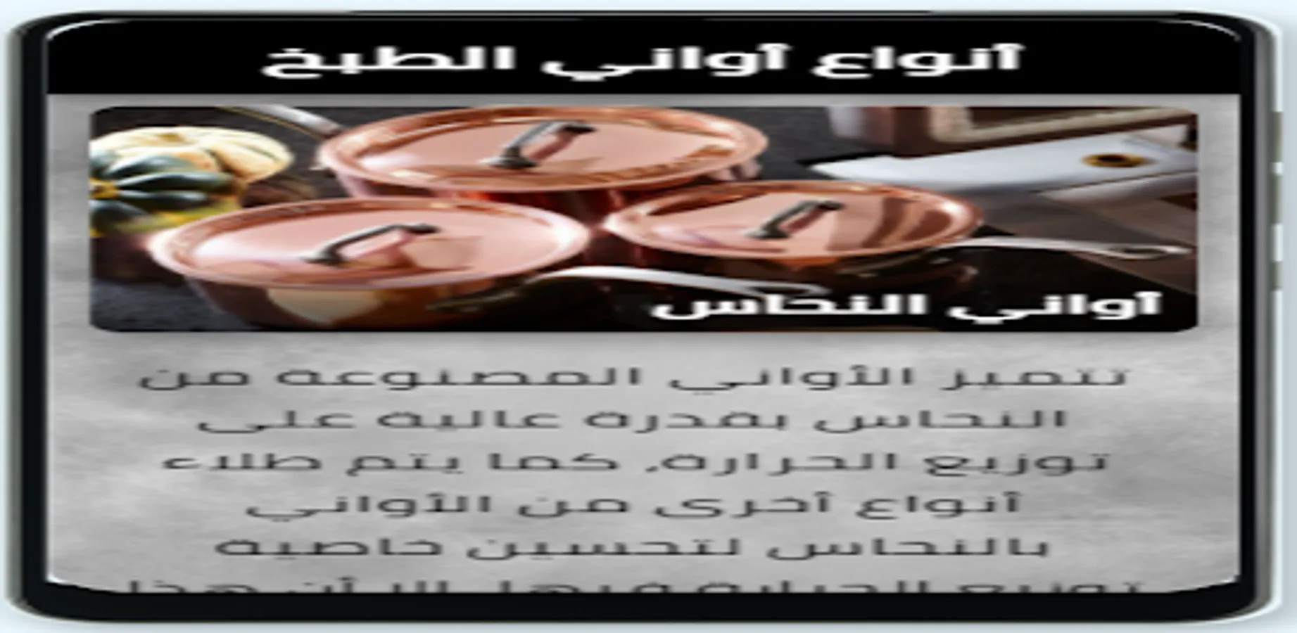The application contains various types of cooking utensils, their uses, and pictures attached to them