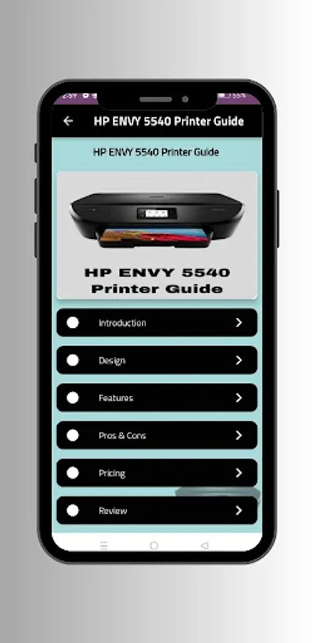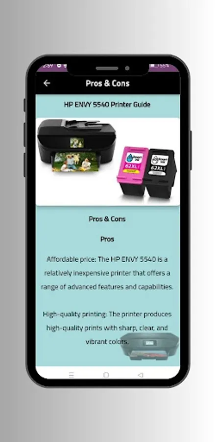 In HP ENVY 5540 Printer Guide pros and cons section, our app outlines the benefits of the HP ENVY 5540's advanced features, such as automatic duplex printing, as well as any potential drawbacks, such as the cost of replacement ink cartridges.