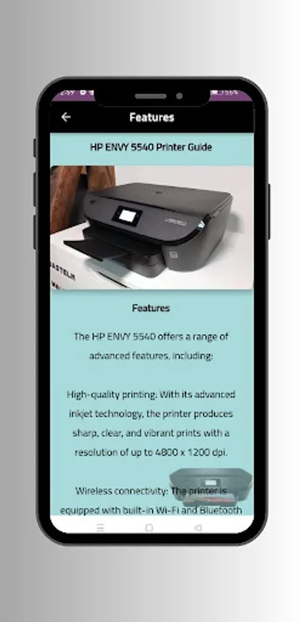 With HP ENVY 5540 Printer Guide app, users can learn about the HP ENVY 5540 printer's sleek and stylish design, which includes a 2.2-inch touch-enabled display for easy navigation. The app provides detailed information on the printer's features, such as its ability to print, scan, and copy, as well as its wireless connectivity options, including Wi-Fi and Bluetooth.