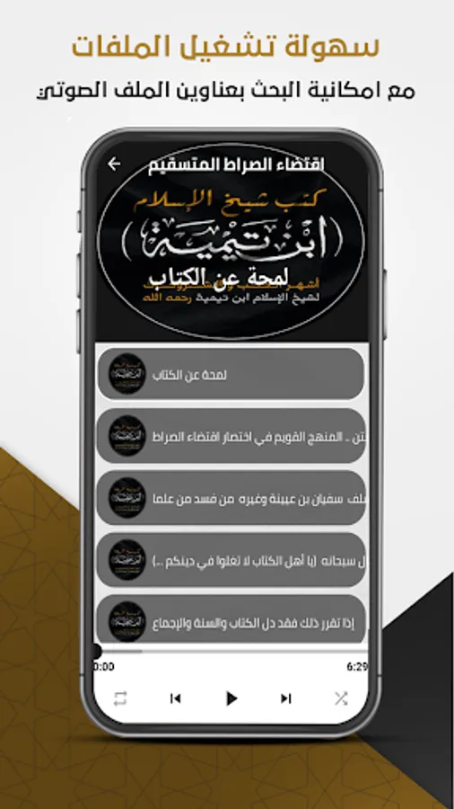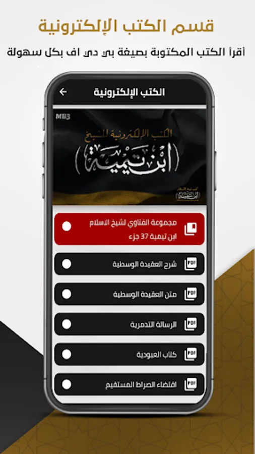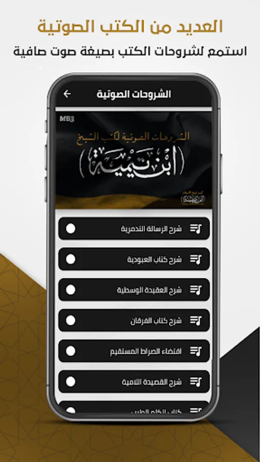The Ibn Taymiyyah library application contains two sections, the audio section for the explanations of Ibn Taymiyyah’s books and the written section, which includes Ibn Taymiyyah’s electronic books