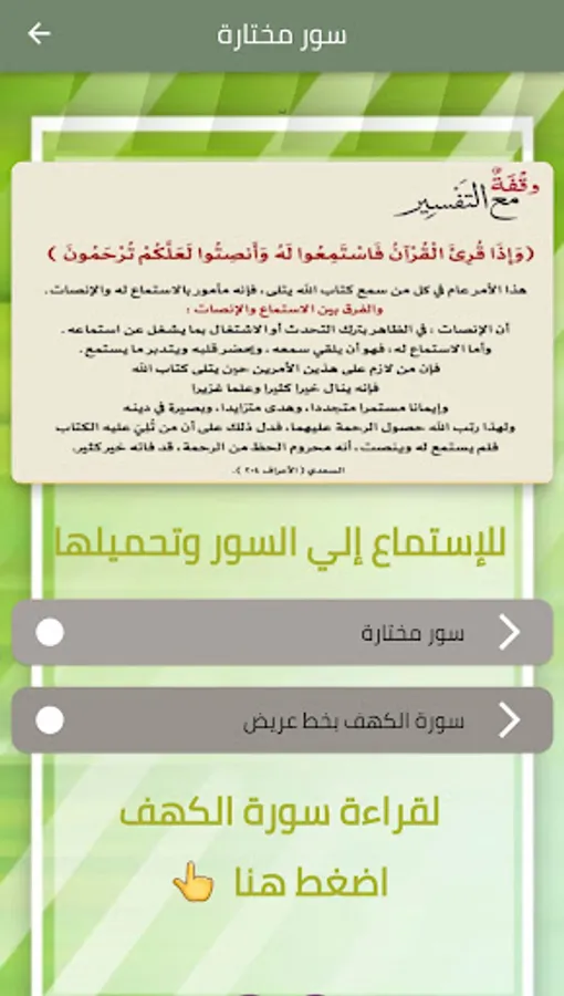 Download the application to download Surat Al-Kahf and selected surahs so that you can download Surat Al-Kahf, Surat Maryam and the rest of the surahs and listen to them and enjoy reading Surat Al-Kahf written in a broad, large and clear font