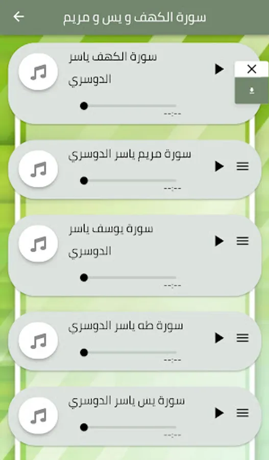 Downloading Surat Al-Kahf and selected suras is an application that allows you to listen and download Surat Al-Kahf with the voice of Sheikh Yasser Al-Dossary and read Surat Al-Kahf written in bold, large and clear font...... The application also allows you to download Surat Al-Kahf and selected suras with the voice of Sheikh Yasser Al-Dosari, in addition to Download Surat Al-Kahf to download and listen to Surat Yusuf, download and listen to Surat Maryam, download and listen to Surat Ya-Seen, download Surat Al-Rahman, Al-Waqi’ah and Surat Taha and listen to them all with the voice of Sheikh Yasser Al-Dosari.