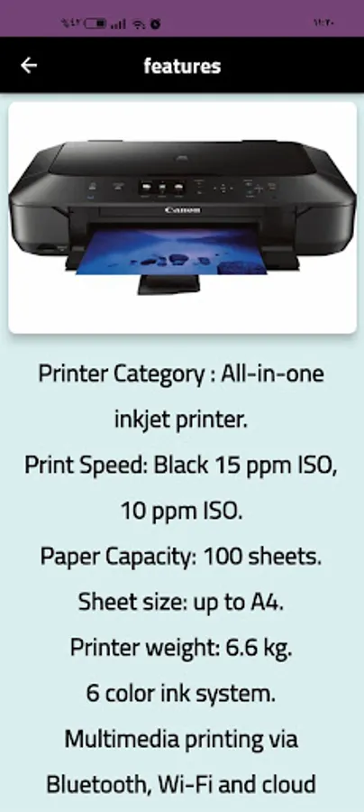An app Canon Pixma Inkjet Printer that gives you information about Canon Pixma Inkjet Printer Features of Canon Pixma Inkjet Printer :-