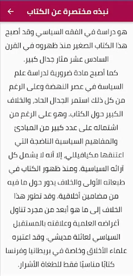 It also became a necessary subject for the study of political science in the Renaissance era, and despite all this, the intense debate continued, and the great disagreement over the book. Although it includes a large number of mature political principles and concepts embraced by Machiavelli, it does not include all of his political views. Since the book appeared in its first editions, the dispute has been about its moral implications. This dispute has evolved beyond just dealing with its scientific purposes and its relationship to the political future of the Medici family. Moralists, especially in Britain and France, considered it a book suitable only for evil tyrants.