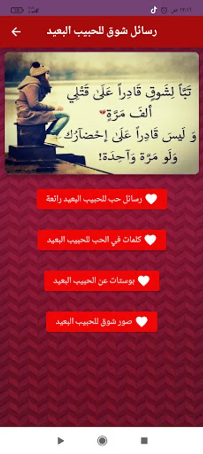 What is more beautiful than having a lover, whose laughter you adore, and your love melts in his beauty, you forget the world when you are next to him, and you do not remember from the world other than the face of your lover, so you look at him, and time stops with you, but life stops, so that you feel as if you live only to look at his beauty, so you love him And your love increases, so you adore him, and your love increases, until he becomes the beloved. He is the air that if you are deprived of him, you die, and your love for your beloved is the soul that, if it passed and left you, was lost and you were like inanimate objects, living in the world without a soul, without hope, without happiness, so you find yourself longing for the beloved. You always miss him like crazy, you miss him even when he is in front of you, so what do you think if this lover moves away from you even for an hour, even for a moment, so how would life be without him, how do you spend those moments of life without seeing him, without hearing his voice, without his smile illuminating your heart Here you will find your heart squeezing from pain, from longing, from love, and the most beautiful feelings of love and longing will emerge from your heart, so that those feelings will come out from the heart to the tongue, so that the tongue will move with them, producing the most wonderful messages of longing for the distant lover, so that these messages will come out and go out to the ears of the beloved, so that he can return to meet you in a hurry And your messages have ignited his heart, and his love for you has increased, and we have collected for you in this application the most beautiful things that the lovers said of longing messages for the beloved father. Eid, and the most wonderful of what poets sing of longing messages for the distant lover, we hope you like it