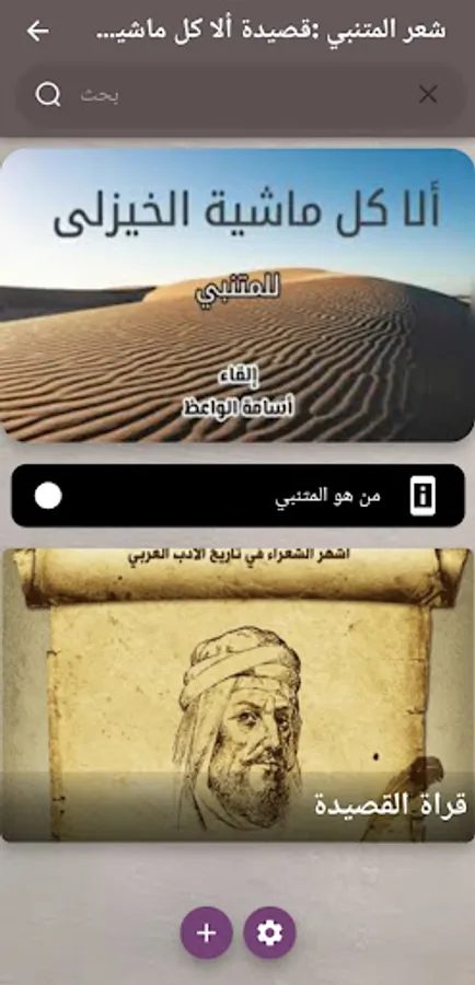 We present to you the most beautiful classical, ghazal, Nabataean, and other types of poetry, in the application of Al-Mutanabbi, except for all the cattle of Al-Khaizli, which included several topics in the teacher, the friend and the father, and in describing the beauty of women, which also included the most important verses, in lamentation, spinning and love, praising the Prophet and monologues God Almighty, download the Al-Mutanabbi application, except for all the cattle of the Khaizli, and enjoy with us the most important and beautiful poetic verses, in the short and long poetry of the most famous Arab poets, including Al-Mutanabbi.