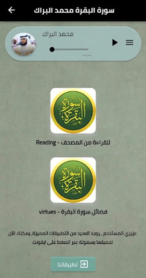 Now try the application, which contains Surat Al-Baqarah, with the voice of Sheikh Muhammad Al-Barrak, from the Holy Qur’an for reading and listening in high quality and updated periodically. The virtues of Surat Al-Baqarah have been added to the application.