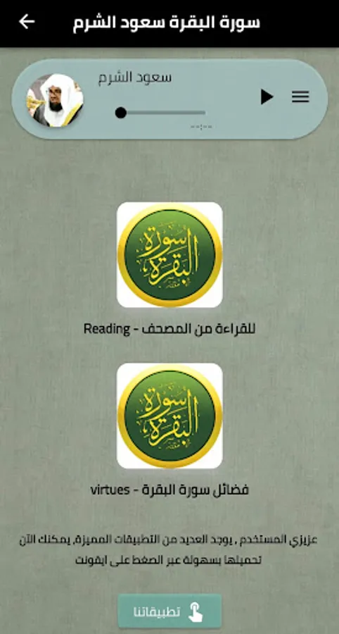 Now try the application, which contains Surat Al-Baqara with the voice of Al-Shuraim from the Holy Qur’an for reading and listening in high quality and updated periodically. The virtues of Surat Al-Baqara have been added in the application.