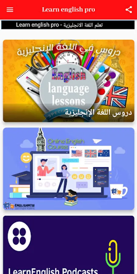The new English language learning application is a comprehensive application for learning English by voice for all levels from scratch to the advanced level and even professionalism. English language in the shortest possible time, the curriculum is based on all types of lessons and courses, including written, audio and visual.
