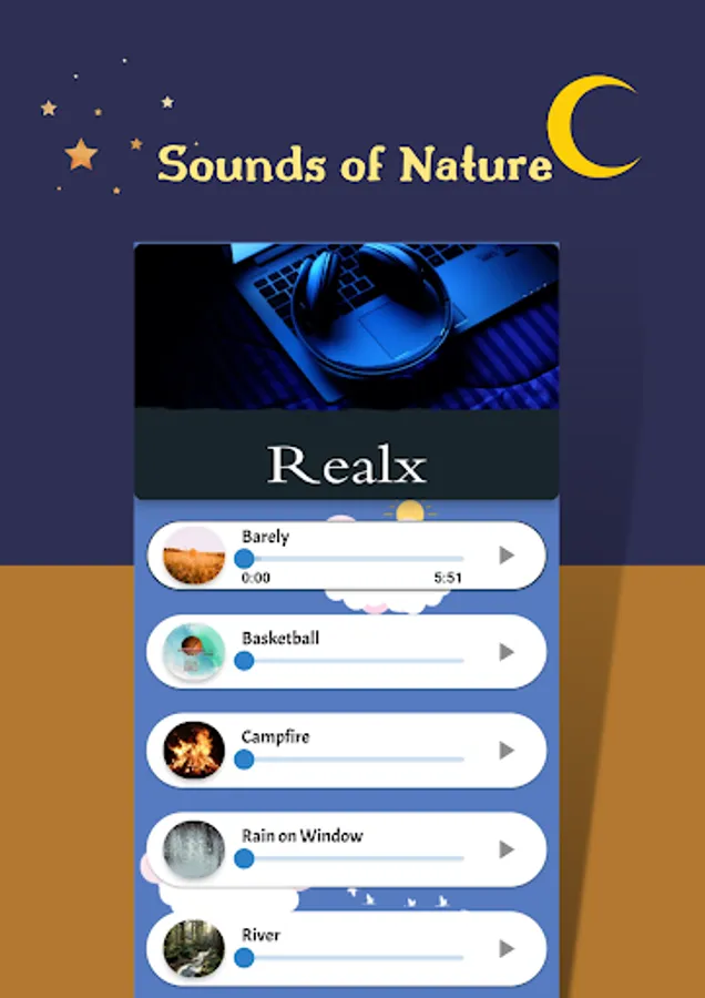 √ Sounds for relaxation: (basketball, fire sounds, river, pencil, jungle night, morning sounds, island, mountain sounds, forest, flute, black bird, valley sound, thunder, shower, rain sound on the window)