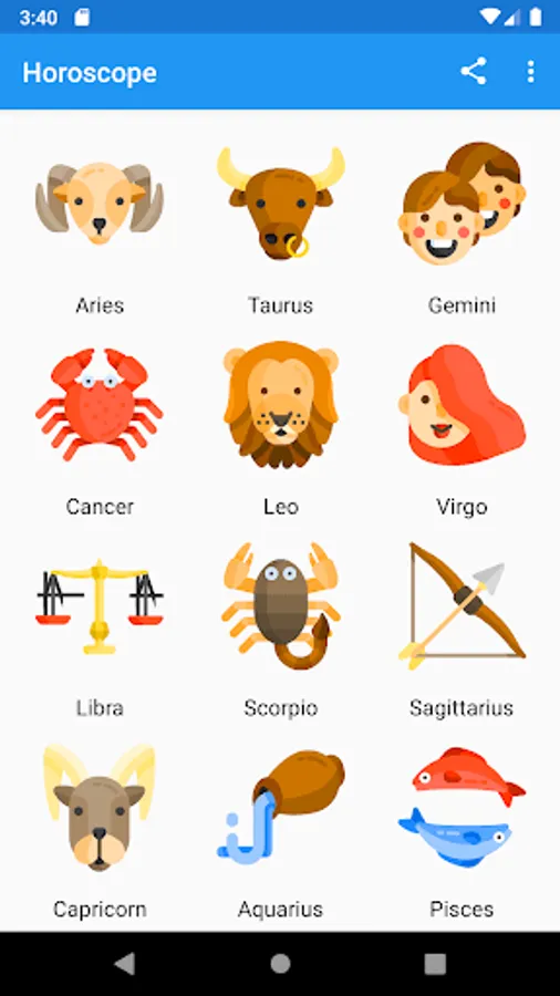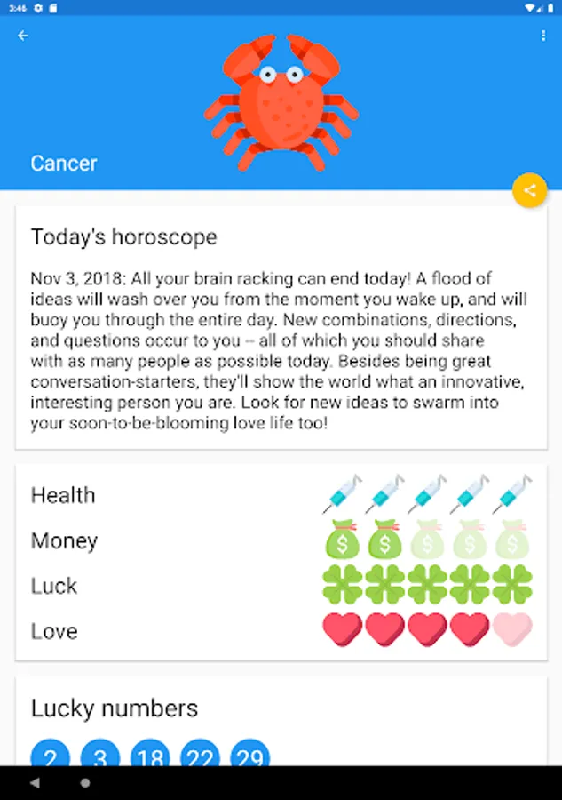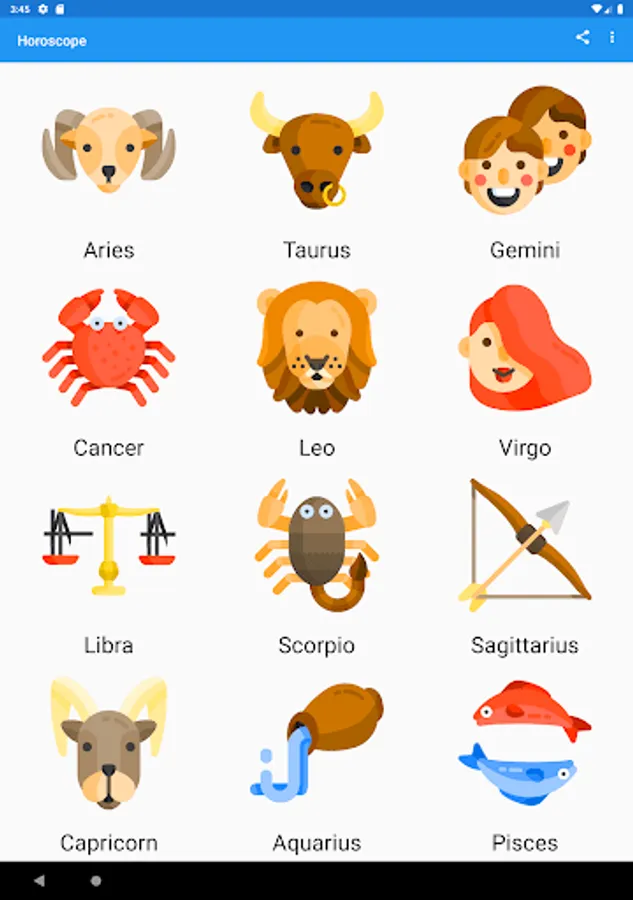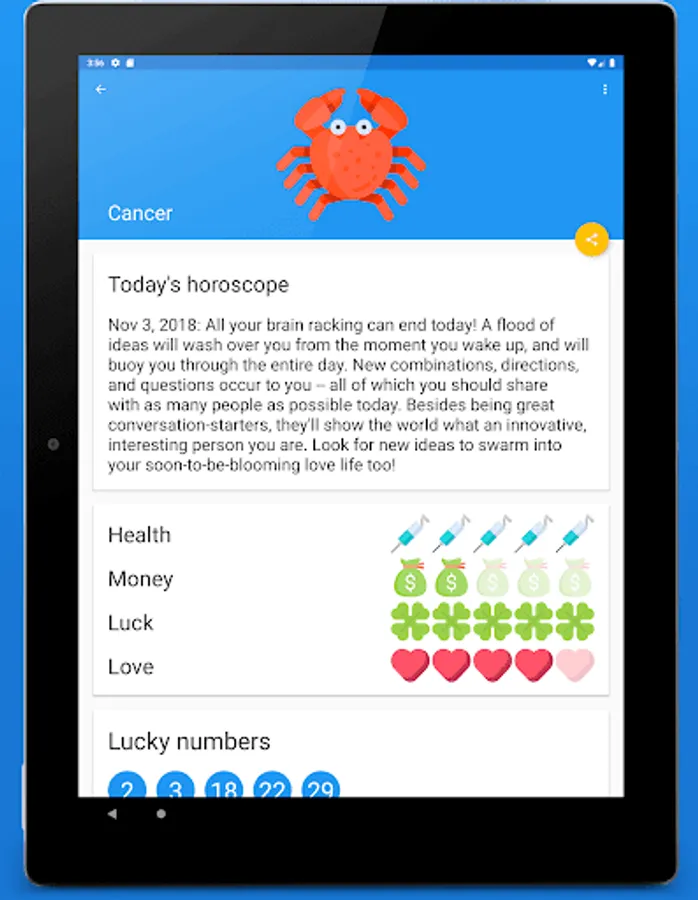 You will get daily horoscope prediction for all 12 signs in more than 40 languages. Additionally, you will get lucky numbers and prediction of your 💊health, 💰money, 🍀luck and ❤️️love.