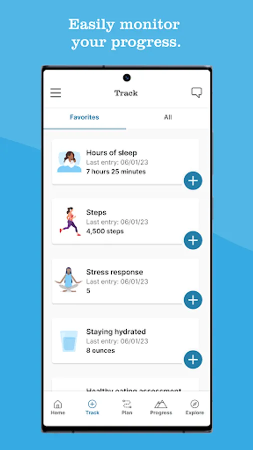 Track areas of health like nutrition, movement, stress, hydration, and more–all in one spot.