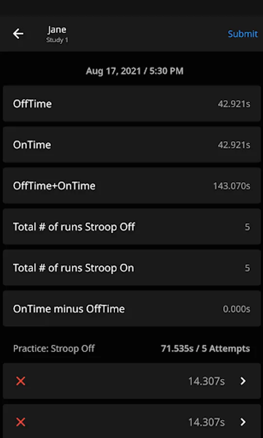 Stroop Test is a test of a users mental speed. A series of runs will be presented to test the users response rate in identifying the color of printed text. The app will track the users score as they progress through numerous rounds of the runs and present them with the results of their test. The user can then compare their score with others, or send the score to a third-party for review.