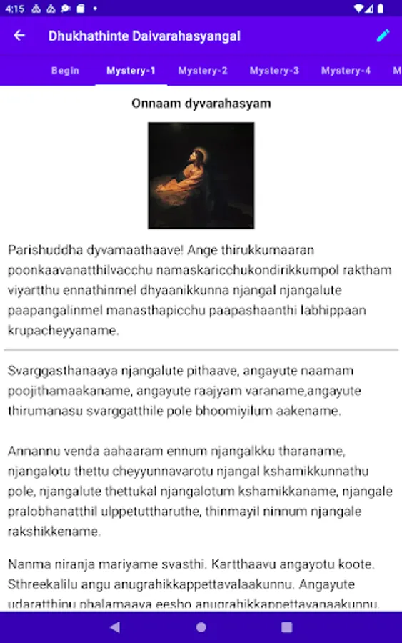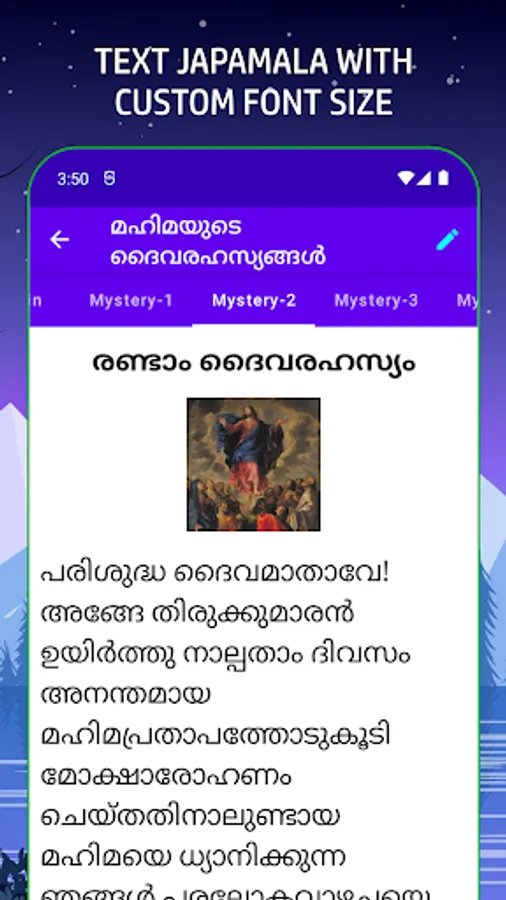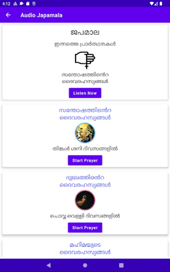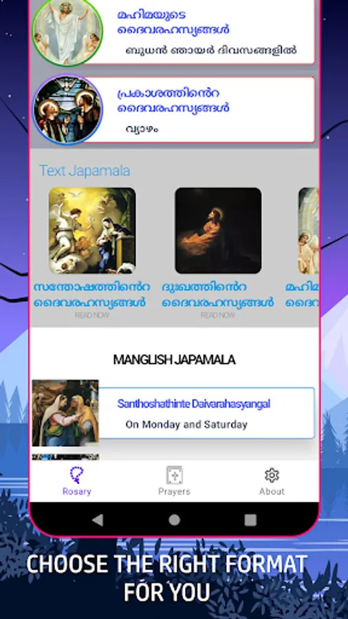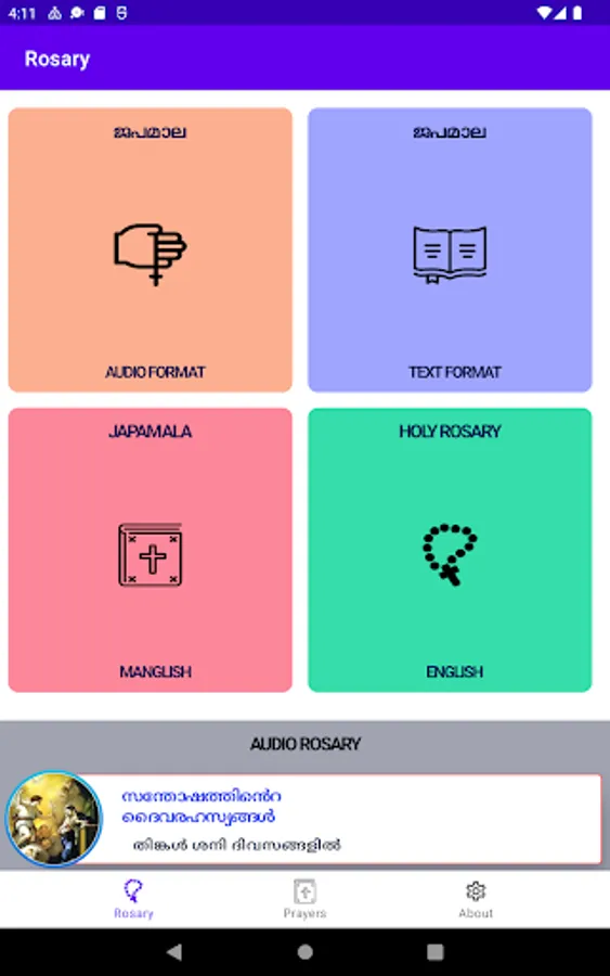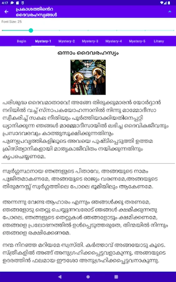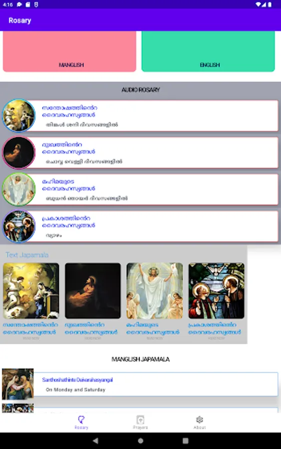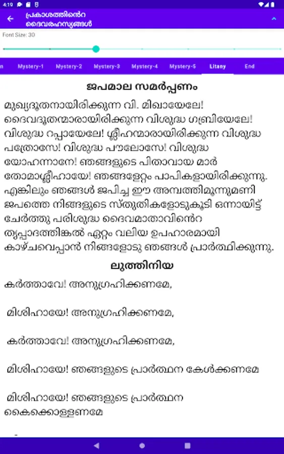 This App contains all the prayers of Rosary in Malayalam language also known as 'Japamala'. This app has the following options: