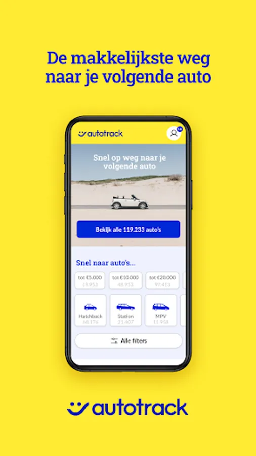 The best Dutch car offer in the palm of your hand! The AutoTrack App is the solution for finding cars. New or second-hand, large or small, sporty or comfortable, you can easily find any type of car with our handy app.