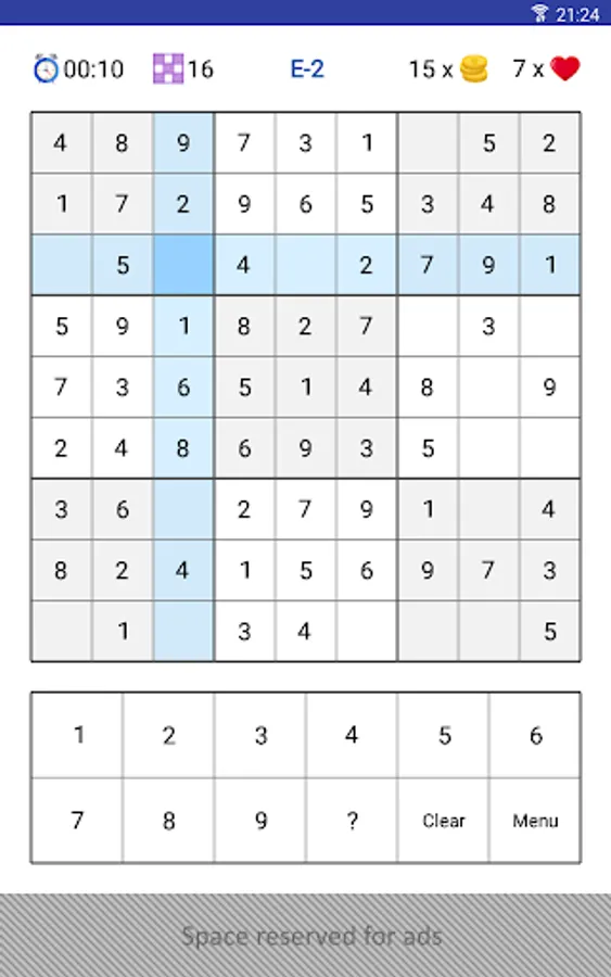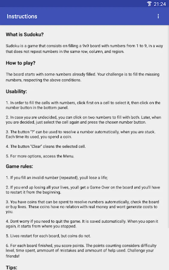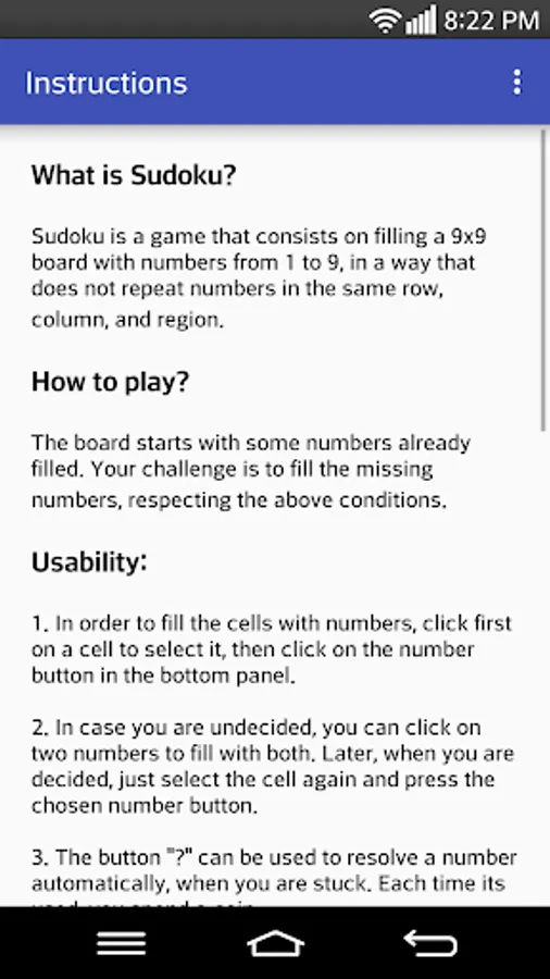 The goal of the game is to place numbers from 1 to 9 in each of the empty cells of a 9x9 grid that consists of 3x3 subgrades called regions. The puzzle contains some initial clues, which are numbers inserted into some cells, that allow a deduction of the numbers in the empty cells. Each column, row, and region can only have one number from 1 to 9. That is, you can not repeat the same number in the same row, column, or region.