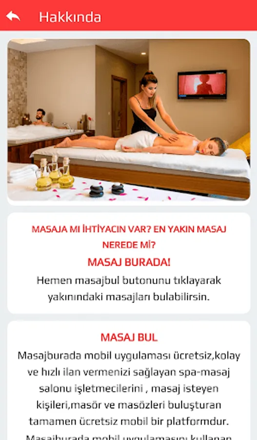 Massageburada mobile application is a free, easy and fast mobile platform that brings together spa-massage parlor operators, people who want massage, masseurs and masseuses.