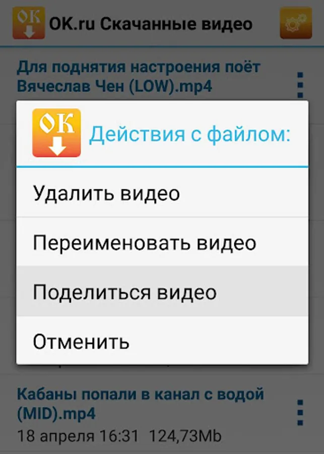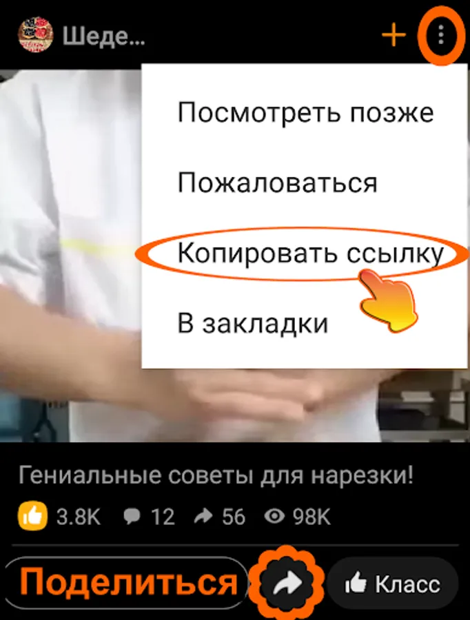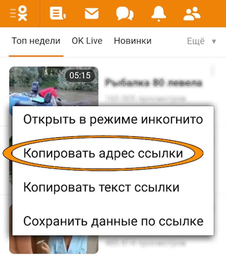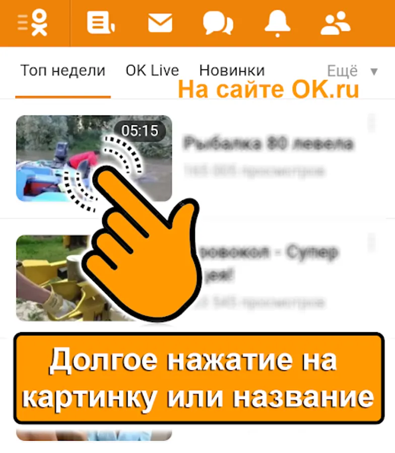 - On the OK.ru website, hold your finger on the description of the video (or on the video itself) so that the menu appears;