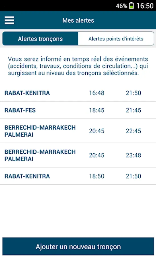 • My alerts: the application uses the GPS on your smartphone to give you real-time traffic events (accidents, work caps, ...) during your journeys on motorways. You can also choose the sections and schedules nerds where you want to be informed.