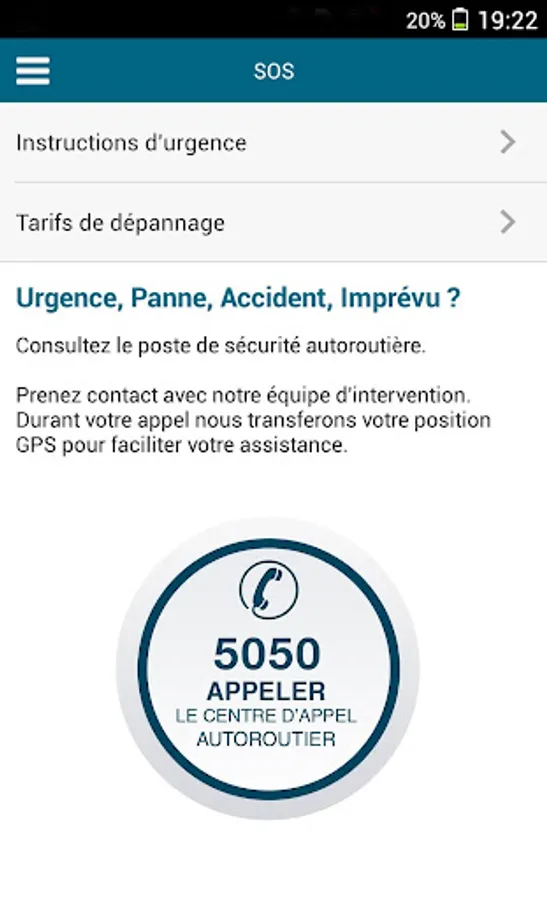 • SOS Motorway: can make an emergency call to the call center ADM 5050 and gives you the safety in case of failure on the highway. Your exact location on the highway will be sent to ADM teams to assist you as quickly as possible.