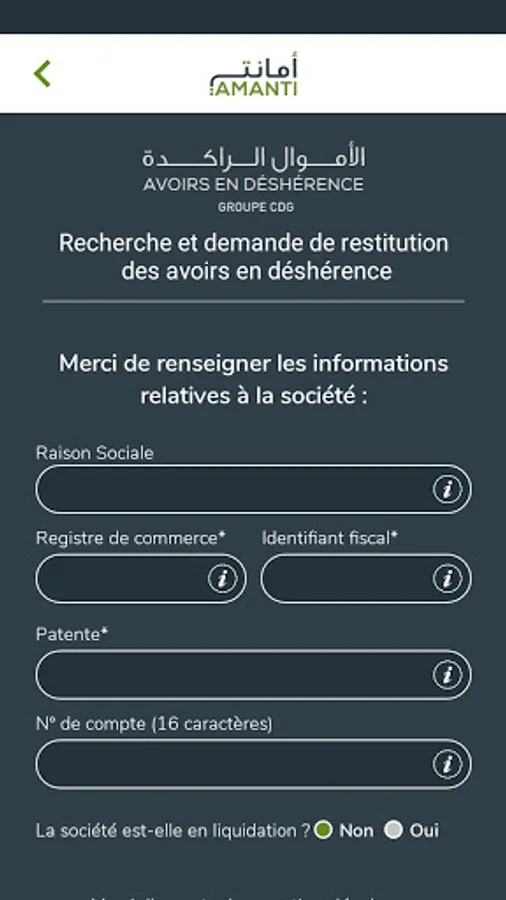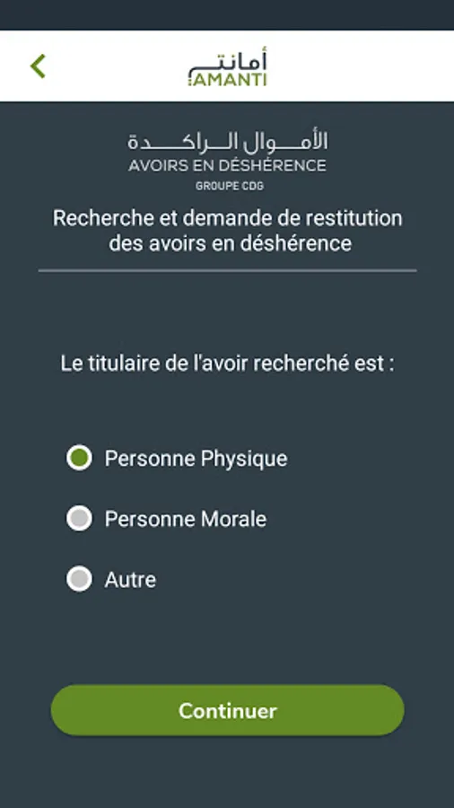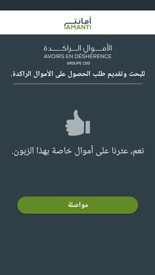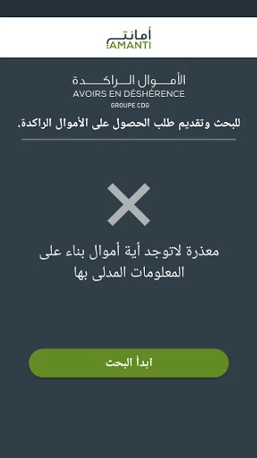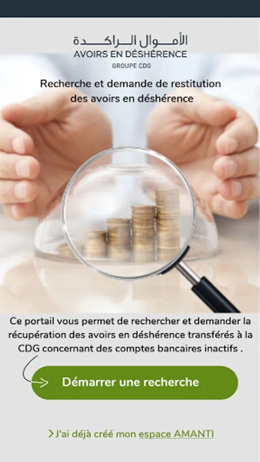 "AMANTI" is a free online service open to the general public, making it possible to search for and request the return of dormant assets registered with the CDG, in application of article 152 of law 103-12 relating to credit institutions and similar organizations.
