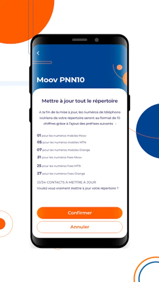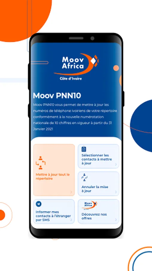Moov PNN10 allows you to update the Ivorian telephone numbers in your directory in accordance with the new 10-digit national numbering in force from January 31, 2021.