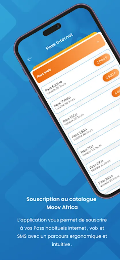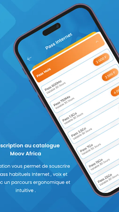 Subscription to the Moov Africa catalog: The application allows you to subscribe to your usual Internet, Voice and SMS Passes with an ergonomic and intuitive path.