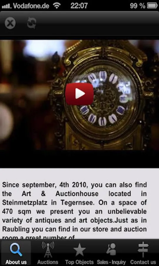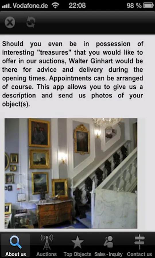 The app presents the products and services of the art and auction house Ginhart in Bavaria, Germany. A short video introduction and a written description summarizes the offerings of Walter Ginhart, an expert in this field with over 30 years of experience.