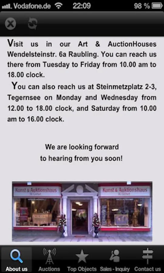 A 1-click button establishes telephonic contact to the two outlets of auction house Ginhart, inquiries can be made by sending an email and a link connects the PC website to the app. The outlet locations are visible on maps, which allow to zoom in on all site details.