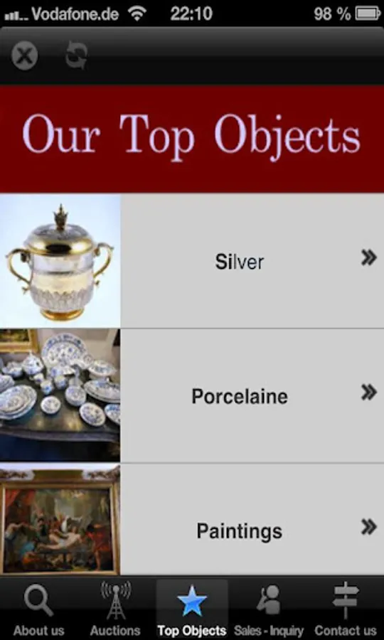 The app user can browse the actual auction catalogue, in which either the auction items can be studied or from where the unsold auction objects in the categories Asiatika, paintings, furniture, porcelain, ecclesiastical arts, silver, clocks and varia can be purchased. The top objects in those categories are displayed separately.