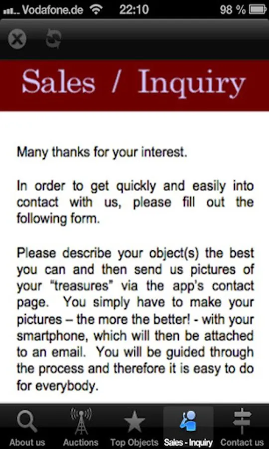 The app makes it very easy to offer and sell objects to W. Ginhart. After filling out a form with all relevant object data, photos of the object can be made and sent by email to the auction house, all without leaving the app.