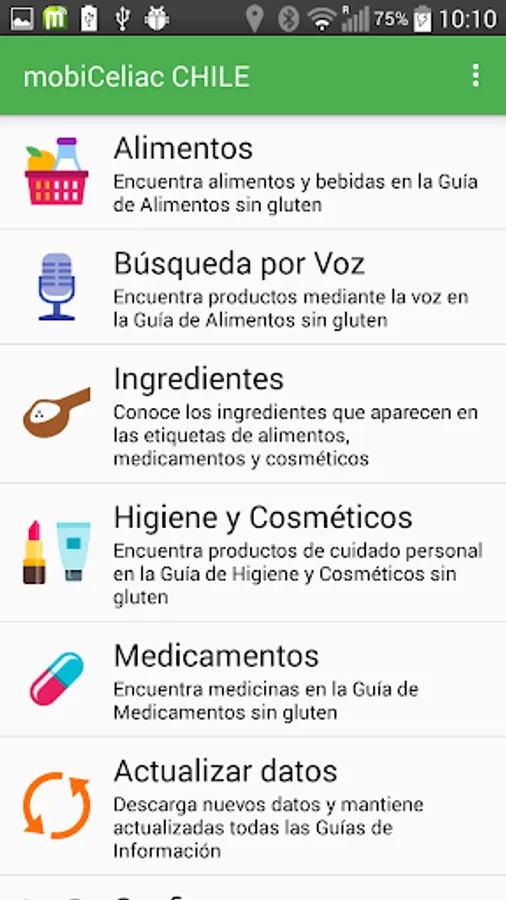- Personal files, to download and save the lists (food, medicines, personal products, establishments, etc.) on the cell phone and not to use the data connection when consulting the lists