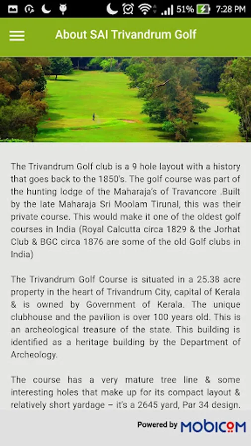 The Trivandrum Golf Course is situated in a 25.38 acre property in the heart of Trivandrum City, capital of Kerala & is owned by Government of Kerala. The unique clubhouse and the pavilion is over 100 years old. This is an archeological treasure of the state. This building is identified as a heritage building by the Department of Archeology.