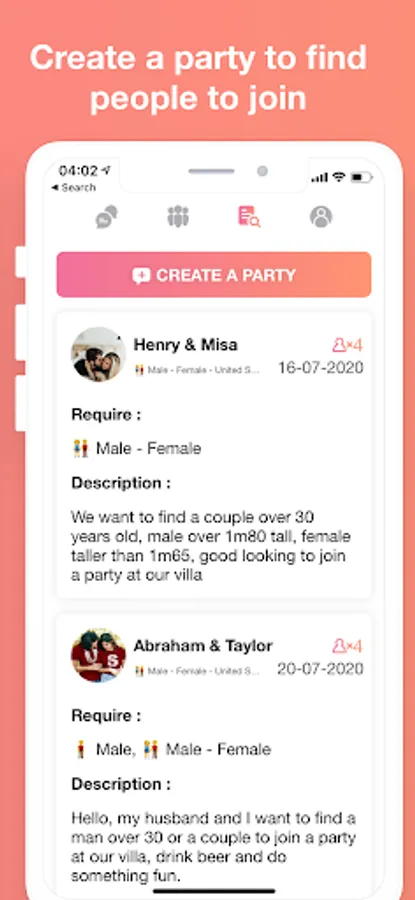 - Create a party: If you want to organize a party and look for people to join, you can create them on Easy3P. People who match your search will see and text you.