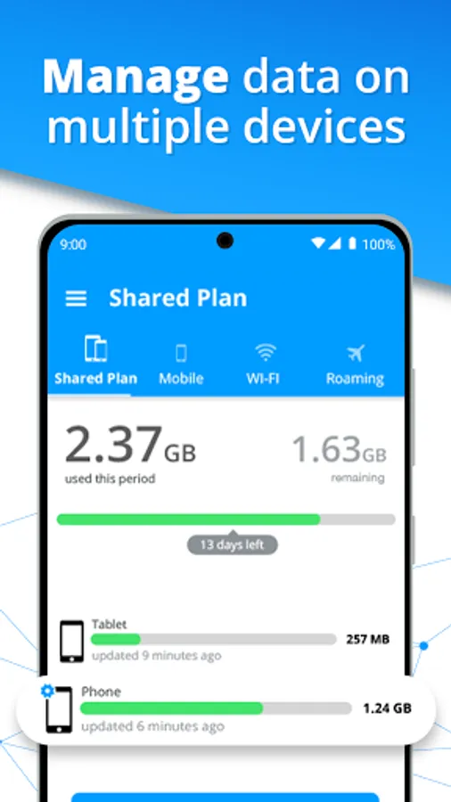 • Monitor your data usage on mobile, Wi-Fi and roaming